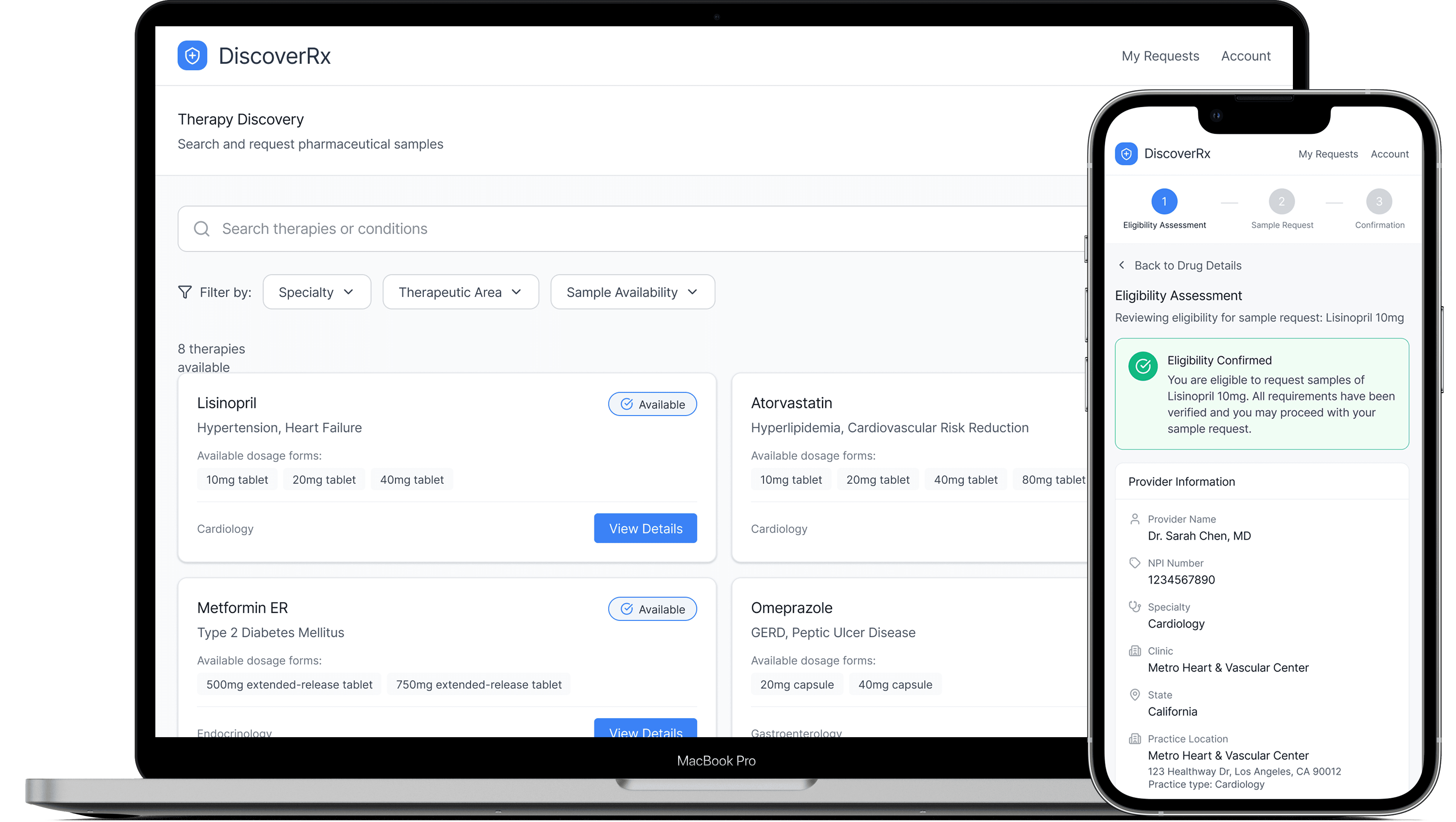 Created an end to end sampling workflow that enabled providers to verify eligibility, explore therapies, and request samples without rep dependency. Designed core IA, clinical review patterns, and compliance gating that allowed manufacturers to scale a secure, digital first model during COVID.