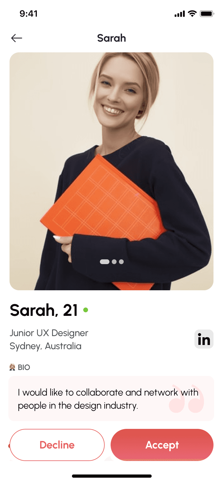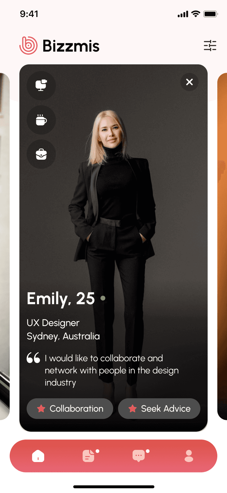 Swipe through professional profiles that highlight goals, location, experience, and interests. The design makes it easy to quickly assess compatibility and reach out.