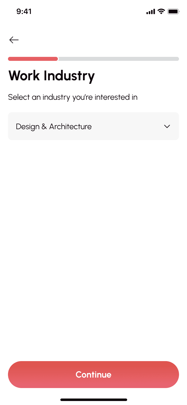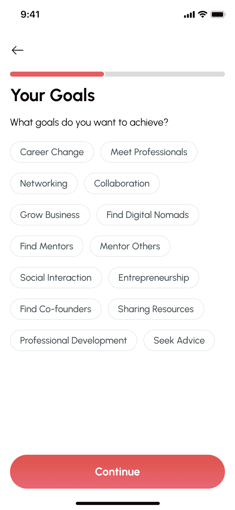 Users customize their experience by selecting work industries, goals (like mentorship, collaboration), and interests — powering personalized feed and match results.