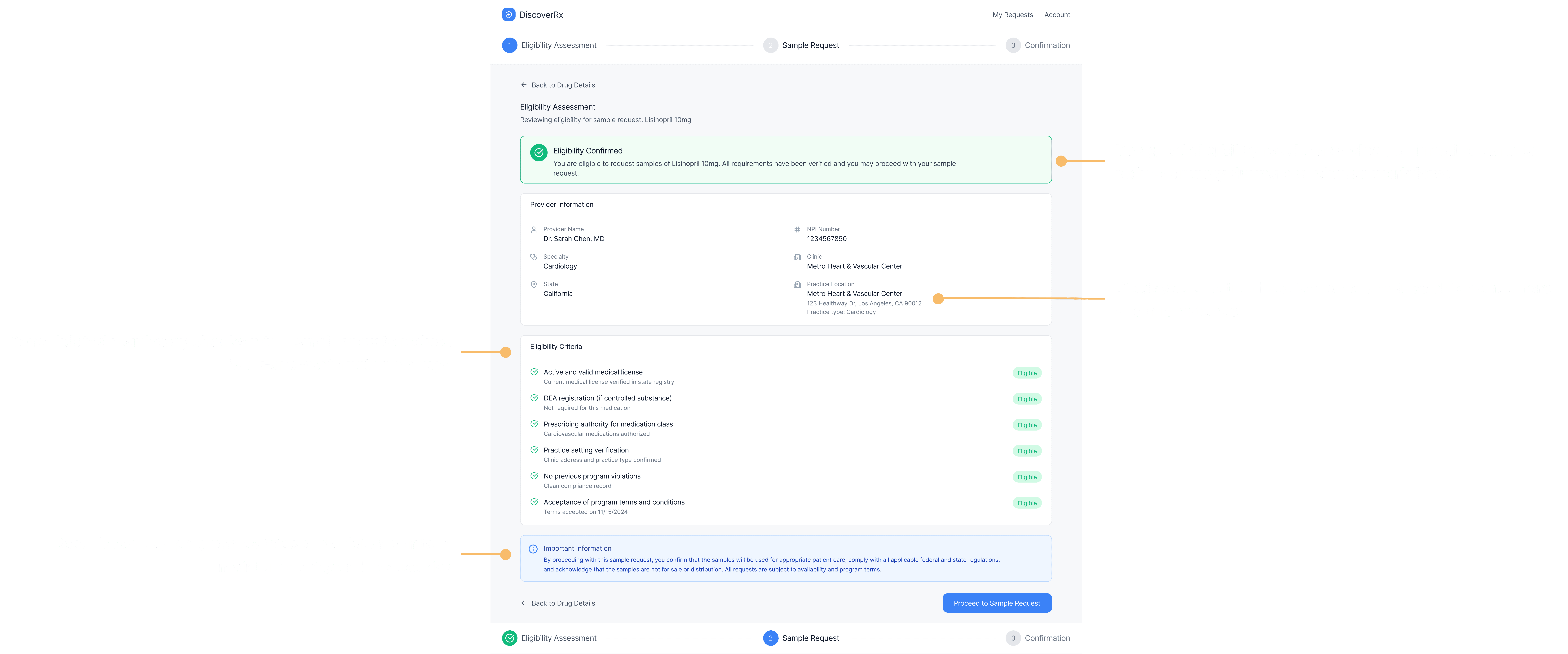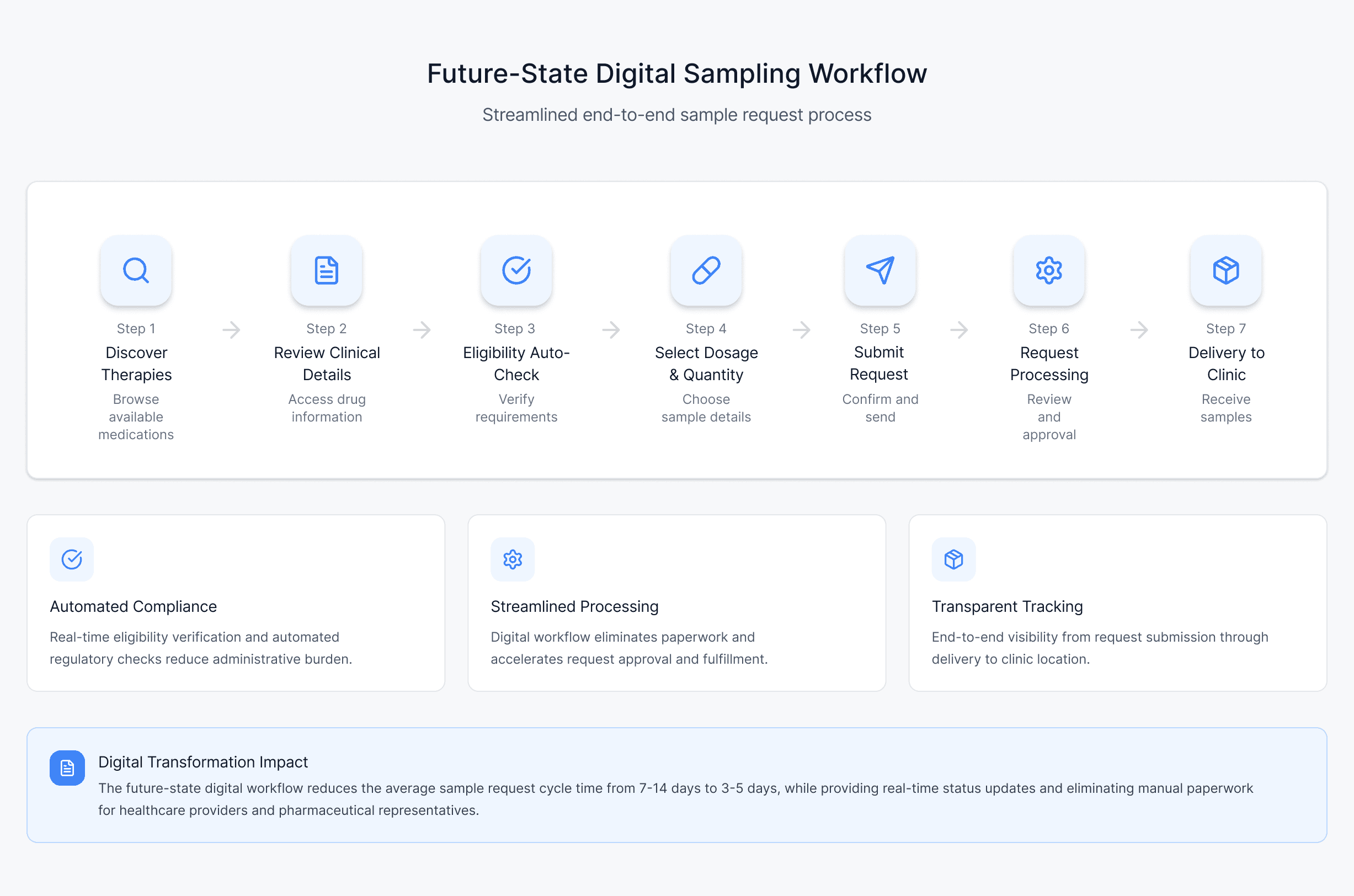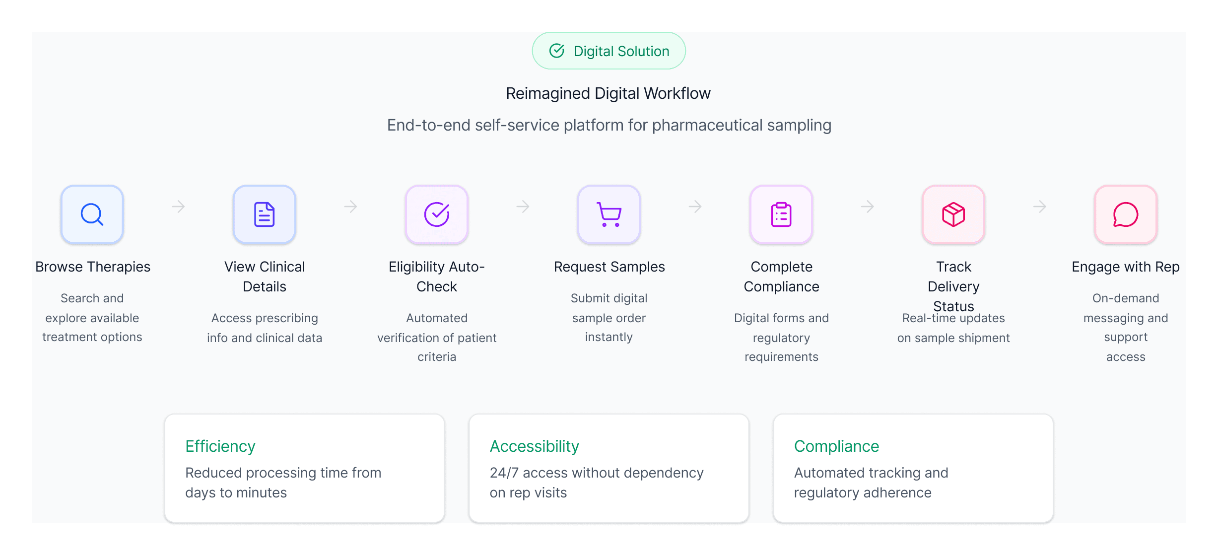 This breakdown made it clear that a digital solution needed to replace rep-led verification, eligibility checks, and sample delivery without adding friction to clinical workflows.