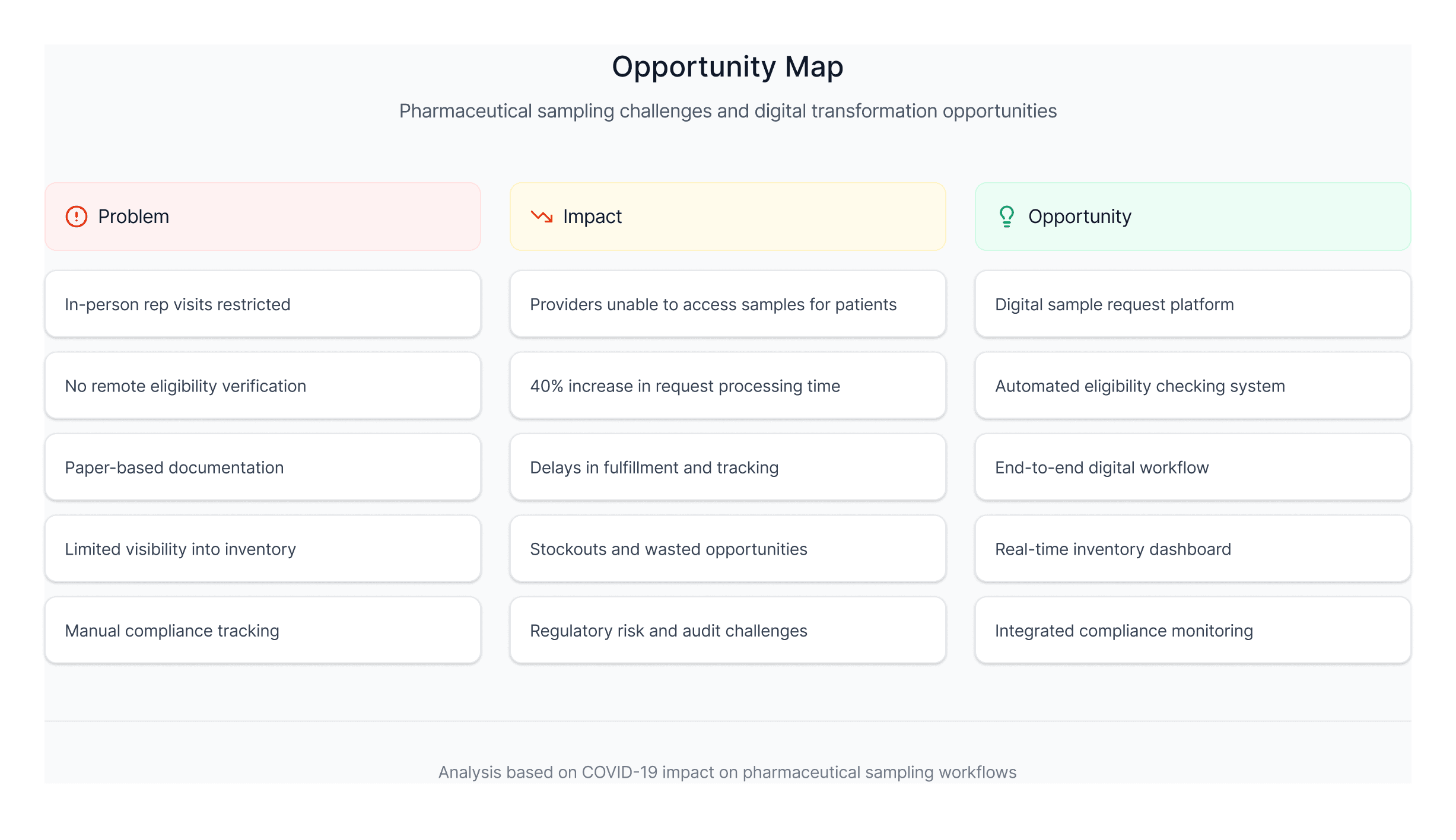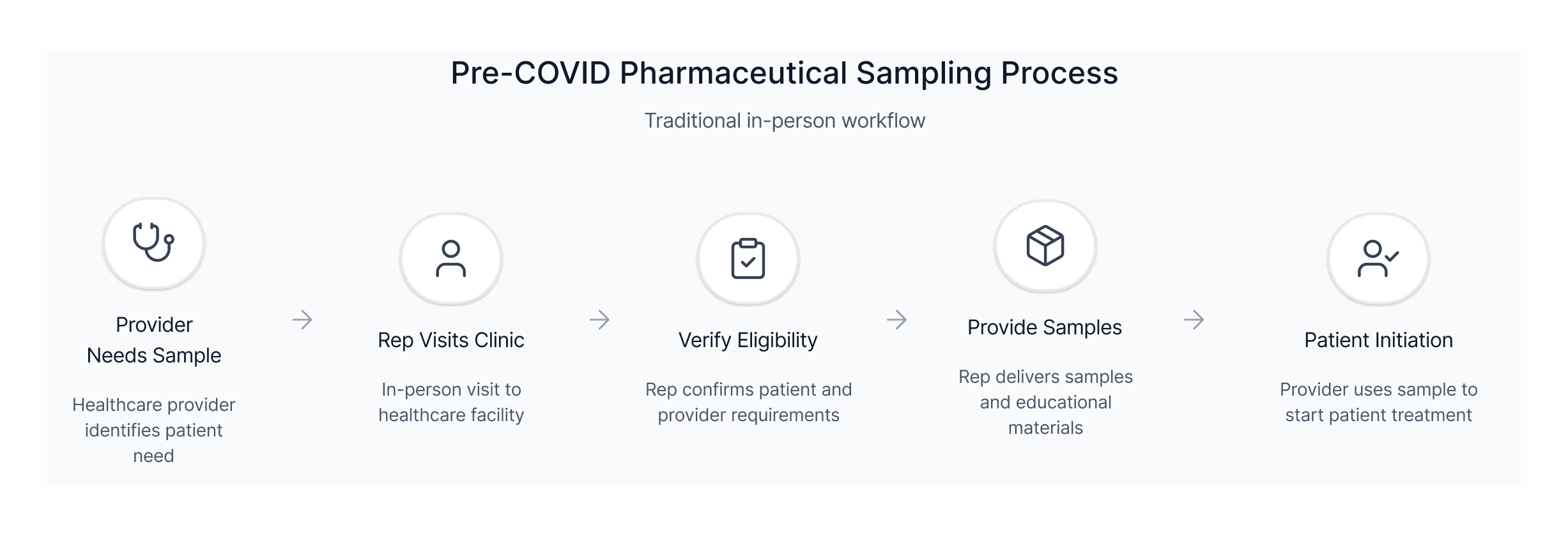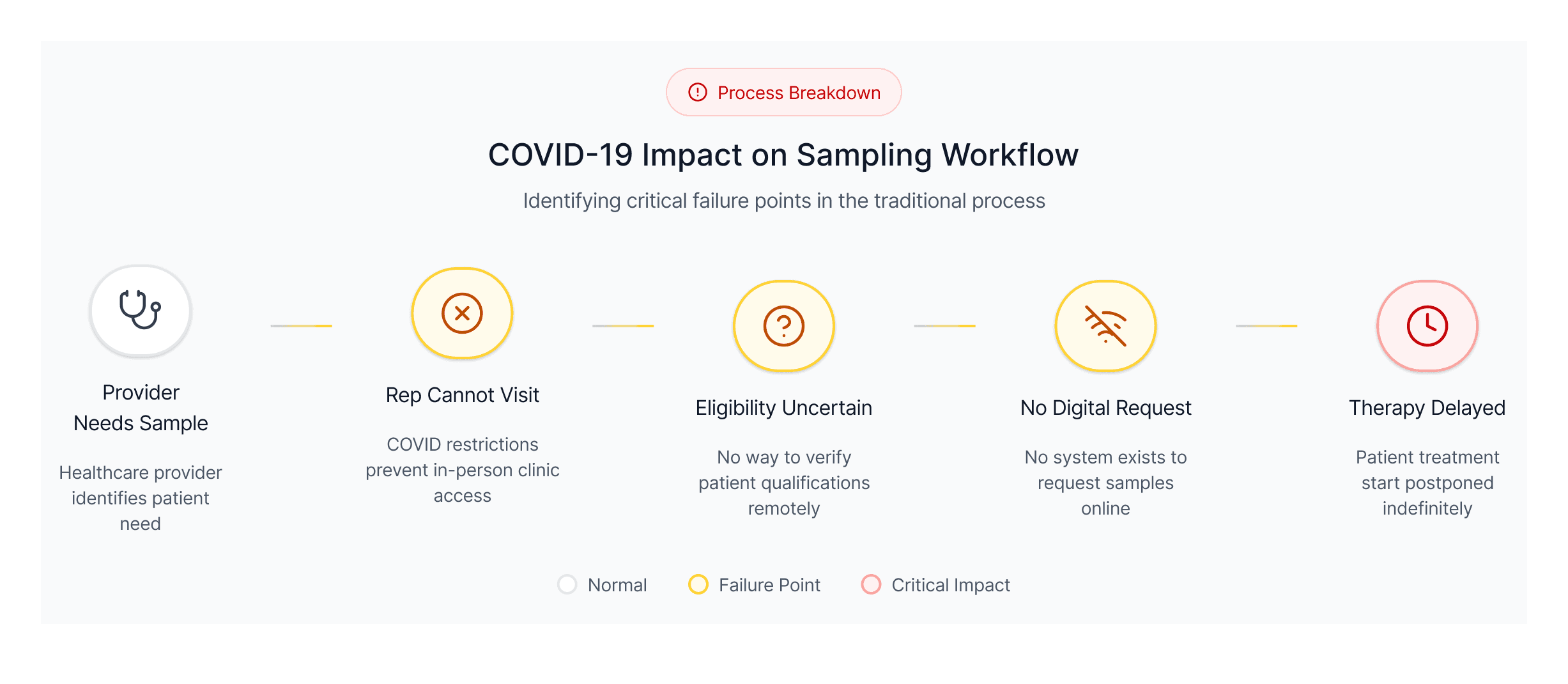 This workflow revealed how dependent sampling was on in-person rep interactions and why COVID eliminated the primary channel providers relied on.