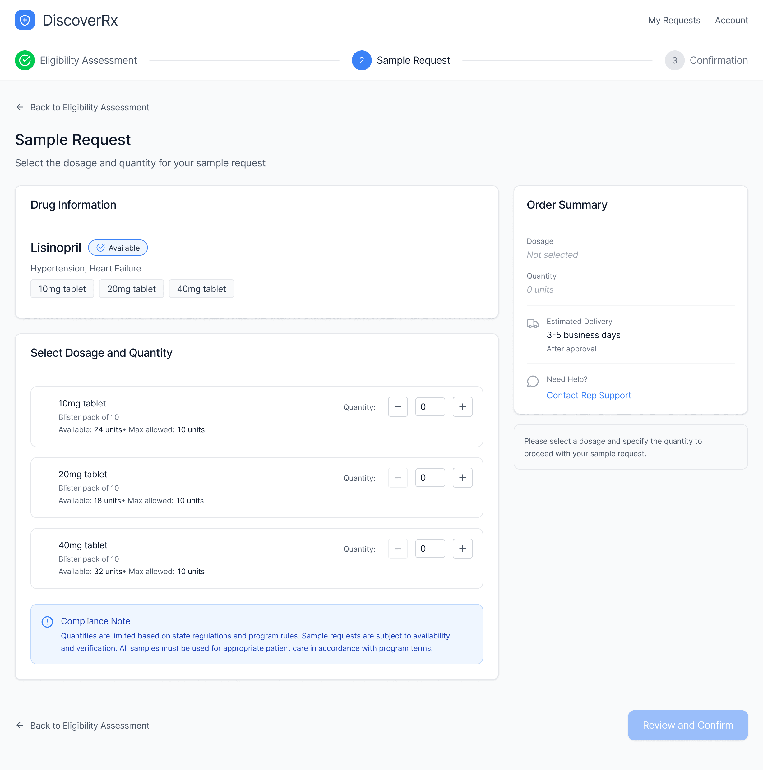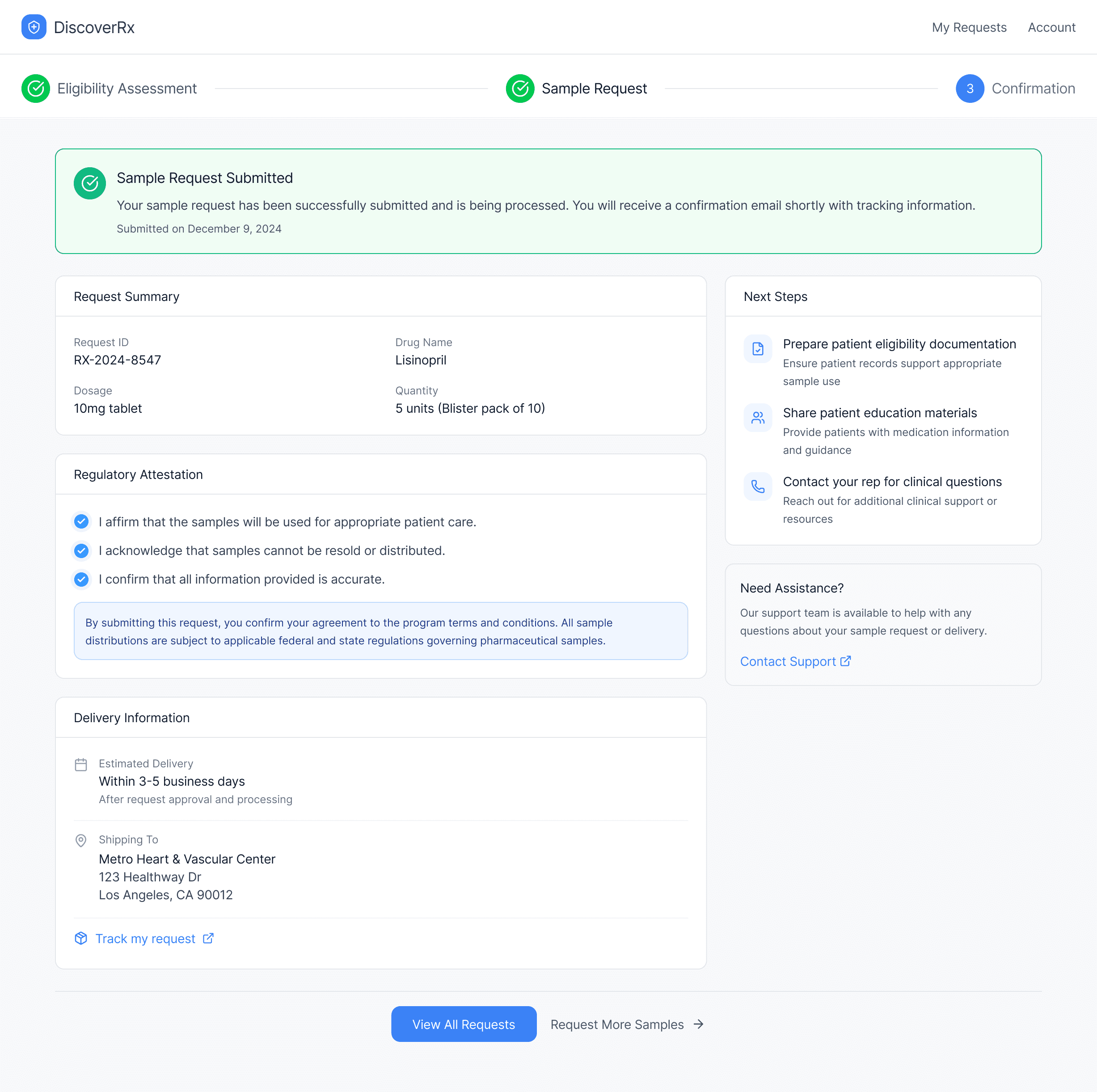 These insights shaped the foundation of the DiscoverRx platform: a fully digital, auditable sampling workflow designed to be faster for clinics and safer for manufacturers.